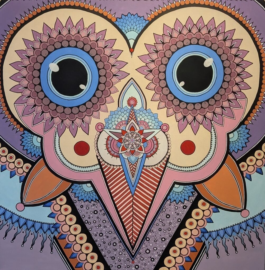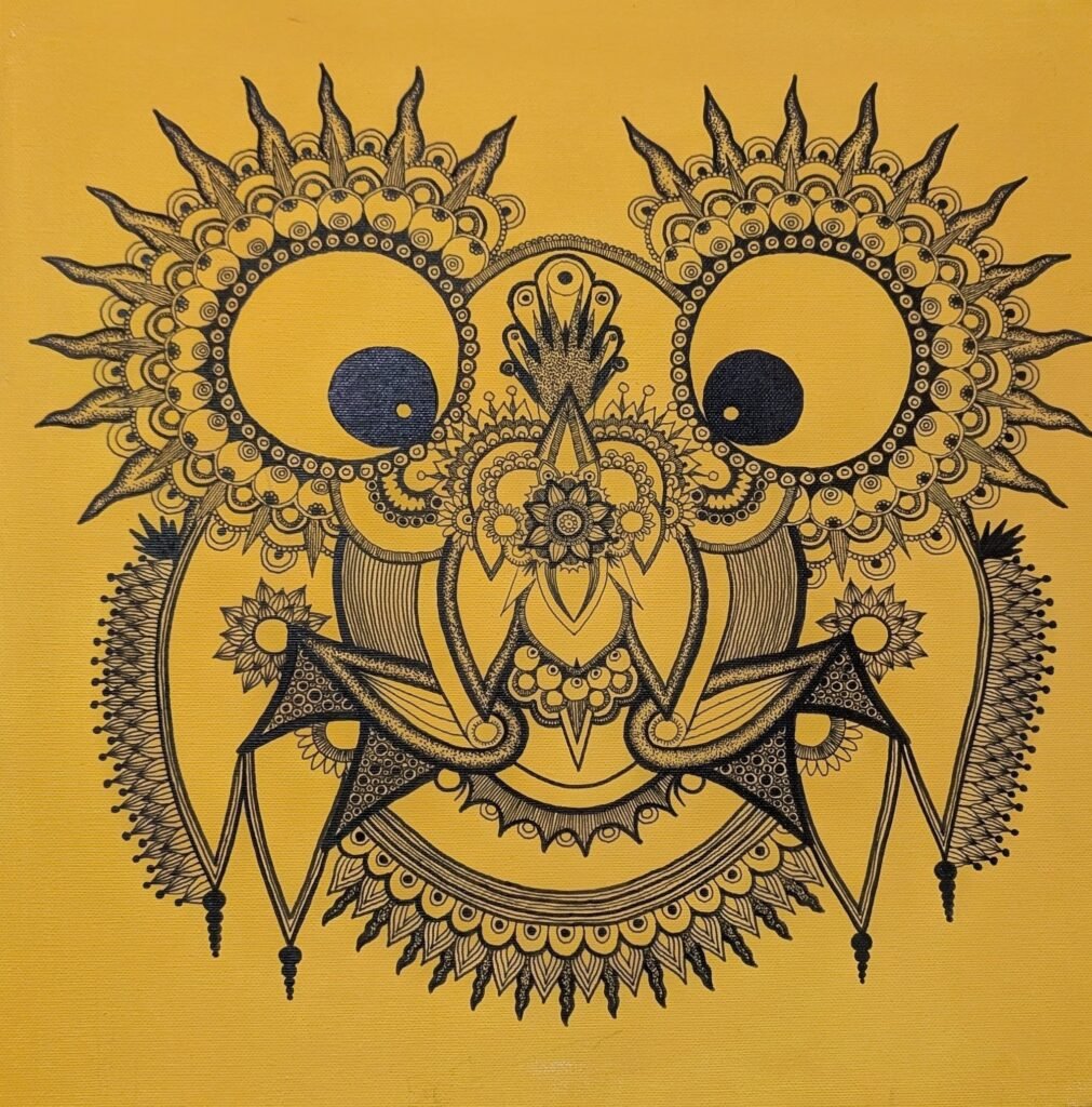 It is a fusion of folk art, mandala art, and zentangle drawing, known for repetitive, complex patterns and balance.