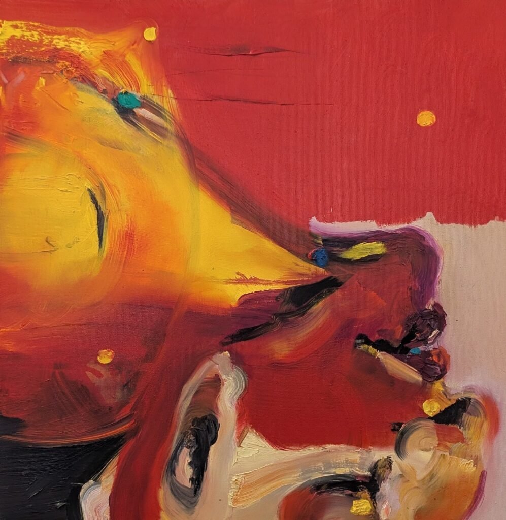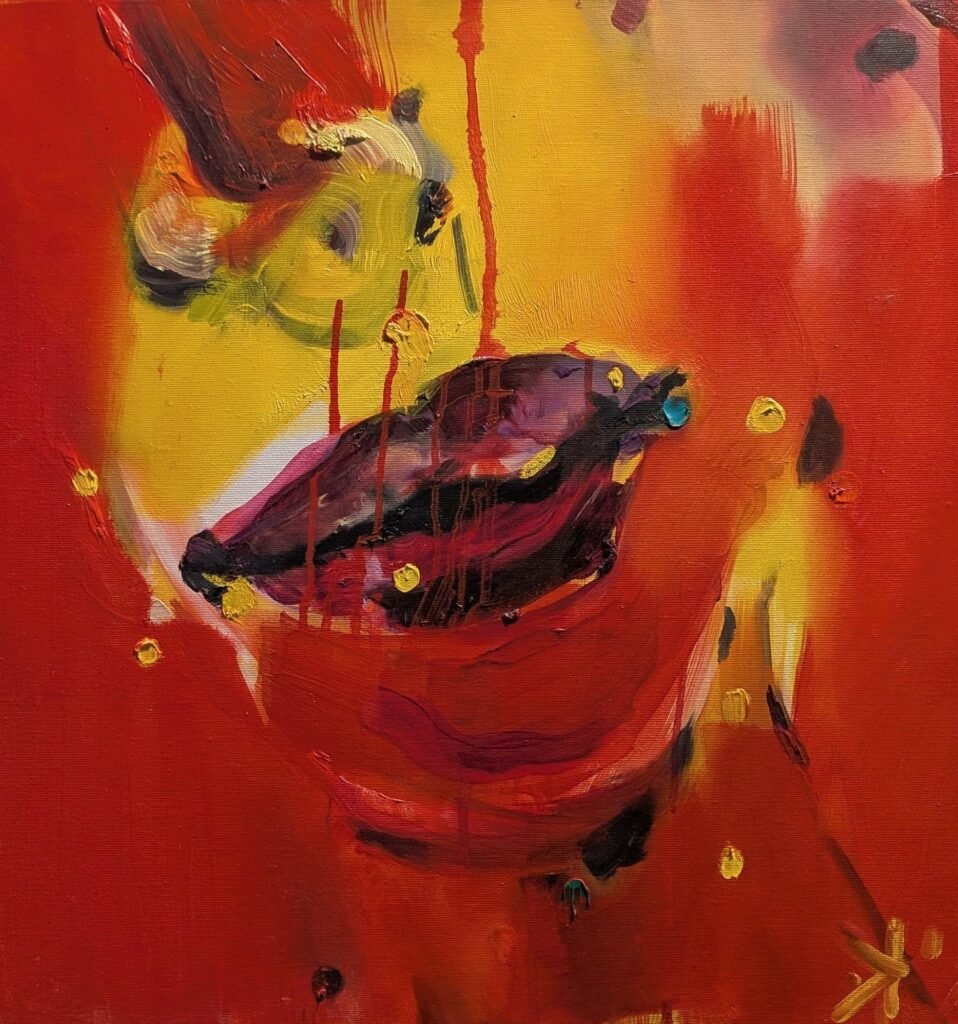 The painting is characterized by large, expressive strokes of vivid red and yellow, creating an intense and warm background that seems to glow. A central form in deep purple and black anchors the composition, with touches of lighter colors giving it volume and a sense of movement. The impasto technique, where paint is applied thickly, adds a rich texture to the canvas. The abstract style allows for a deeply personal interpretation, aiming to communicate fundamental human emotions